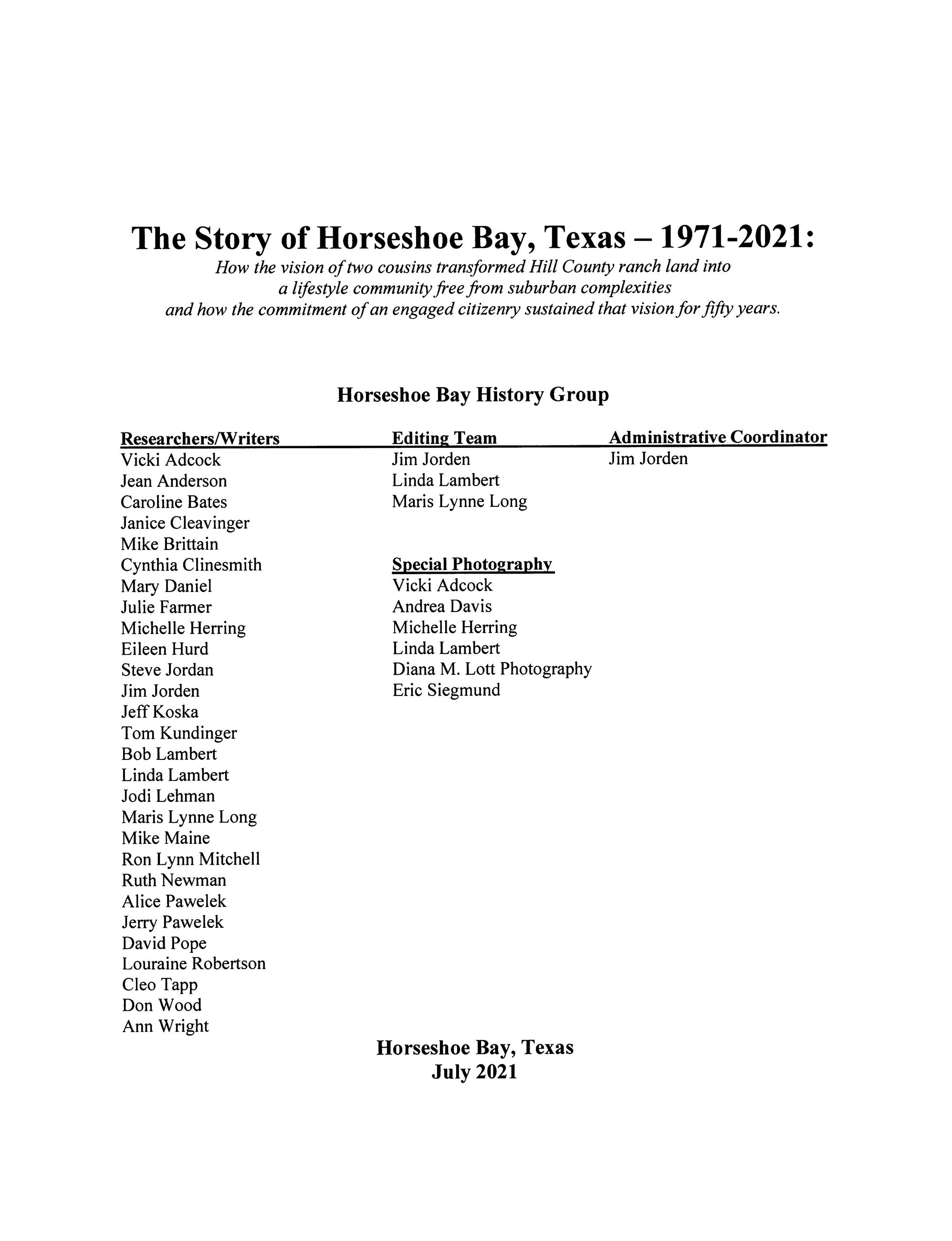 In honor of the Horseshoe Bay Resort's 50th Anniversary, a group of citizens worked together to write the book, "The Story of Horseshoe Bay, Texas 1971-2021." The book's co-editors, Linda Lambert and Jim Jorden, worked to bring together the stories and articles from a variety of sources. This historic book is available for purchase at Quail Point Lodge (107 Twilight Lane) or City Hall (1 Community Drive) in Horseshoe Bay for $20. Take a look at the book cover, list of contributors, table of contents, and other details below!