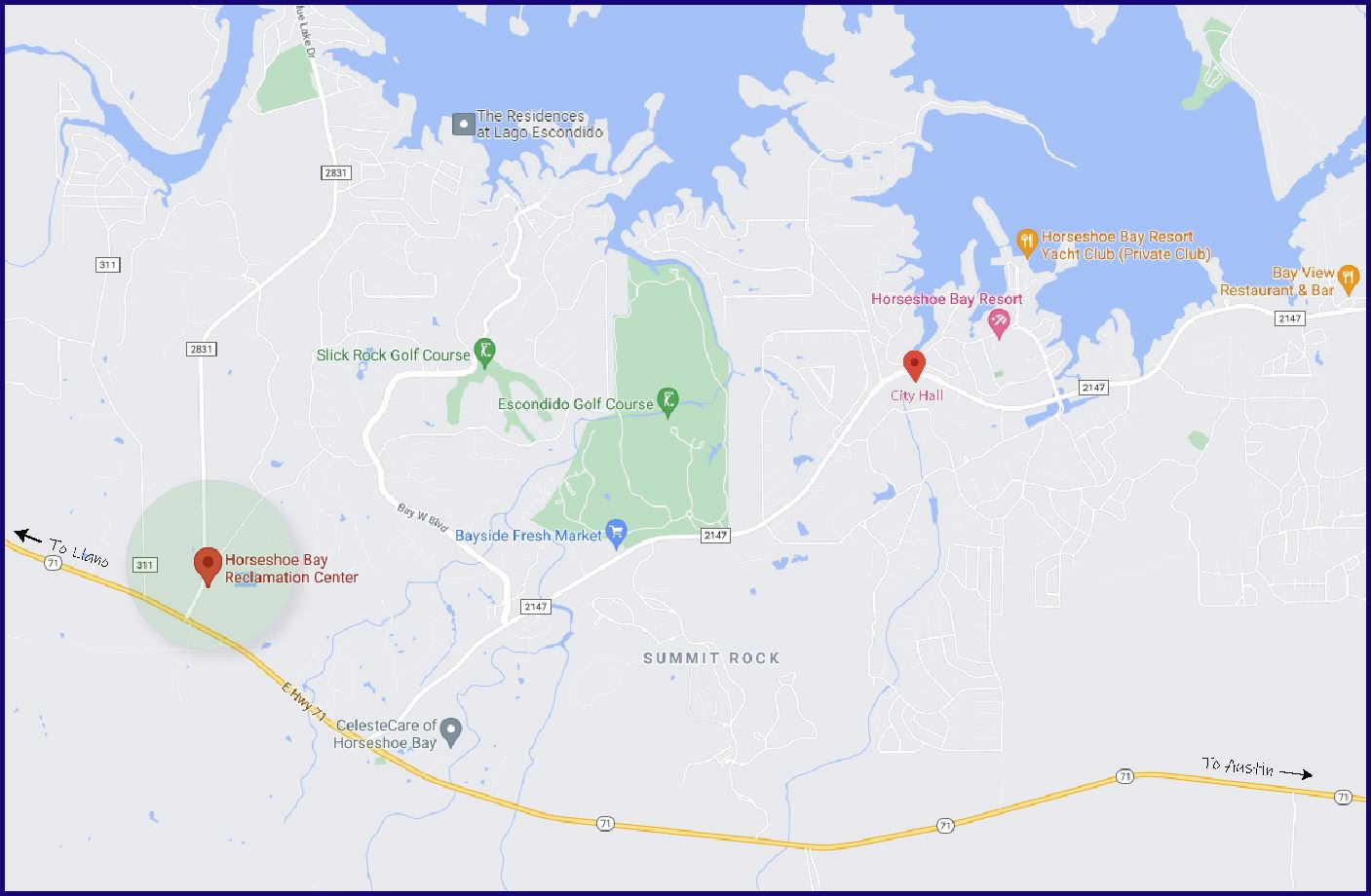 • The recycle and compactor center is available to all residents of the City of Horseshoe Bay. The center is located approximately 0.1 miles north of Highway 71 on Highway 2831, adjacent to the City’s wastewater treatment plant.
