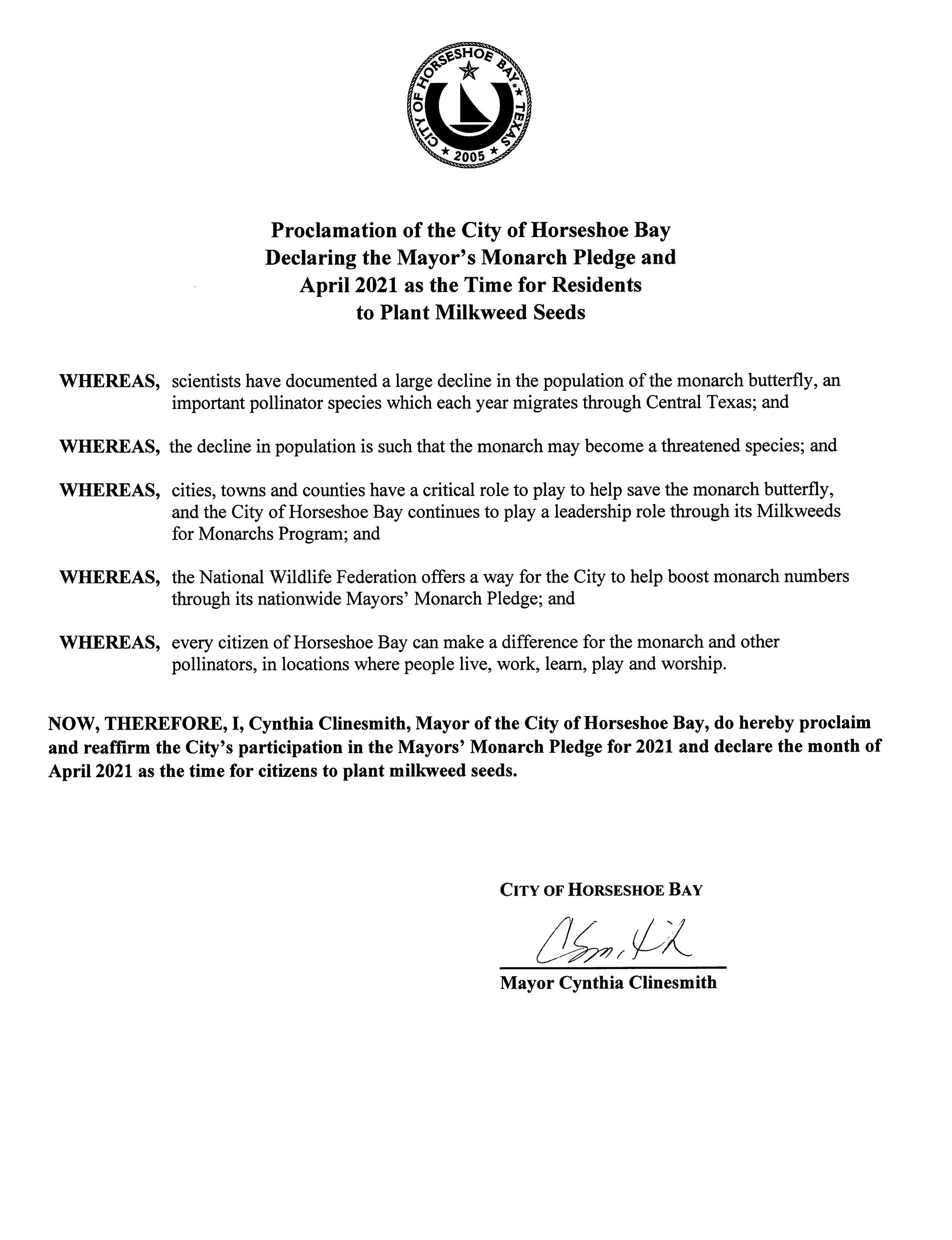 At yesterday's City Council meeting, Mayor Clinesmith presented the Mayor’s Monarch Pledge. She discussed the City’s commitment to protect our environment. Part of that effort includes our participation in a national endeavor by the National Wildlife Federation to preserve the Monarch butterfly. The population has suffered a sharp decline in numbers during the last 25 years. The City joined the pledge four years ago under the guidance of previous Mayor Steve Jordan. One of the requirements of continued participation is that we renew the pledge annually. By taking the pledge we promise to take part in activities which will promote the Monarch’s survival. These activities include education of residents, milkweed, and nectar plant seed giveaways, altered mowing schedules to protect breeding habitats, and the promotion of Monarch-friendly gardens being planted in our City. Mayor Clinesmith encouraged City residents to support the efforts being made by the City and to initiate ways to incorporate Monarch friendly efforts on their individual properties. More information can be found on the following webpage: http://www.horseshoe-bay-tx.gov/453/Mayors-Monarch-Pledge
